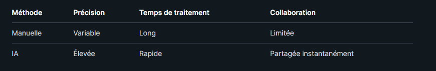 Méthode Précision Temps de traitement Collaboration Manuelle Variable Long Limitée IA Élevée Rapide Partagée instantanément L’automatisation permet aussi de stocker les transcriptions dans des espaces partagés, facilitant la recherche et la consultation ultérieure.