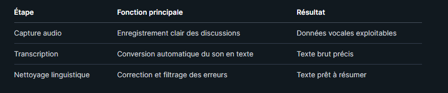 L’agent IA capture et transcrit l’intégralité des échanges en temps réel. Il applique ensuite des algorithmes pour structurer le texte et identifier les thèmes importants.
