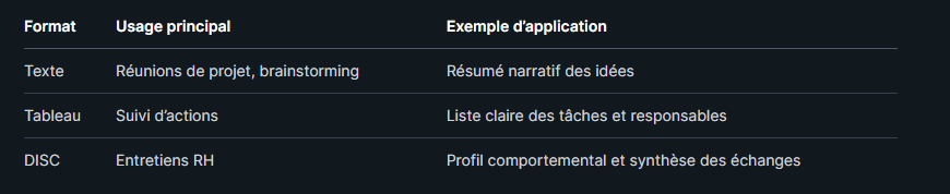 Un agent IA peut générer plusieurs formats de compte rendu selon les besoins.